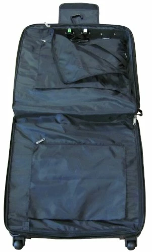 Details: Pack suits, dresses, and other hanging garments neatly inside this wheeled garment bag from AmeriLeather. The AmeriLeather Wheeled Leather Garment Bag is crafted from top grain cowhide leather and features a book-opening design that makes it easy to pack and a telescopic handle and corner mounted wheels that make it easy to maneuver. This garment bag has a fully lined interior with hanging brackets and includes two plastic hangers, cross straps to hold garments in place, and an inner cover with two large zippered pockets to hold belt, ties, socks, and undergarments. Exterior zipper pockets offer added storage for toiletries, accessories, and personal items that you need to keep within easy reach.