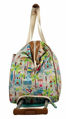 Lily Bloom, a handbag and accessories line focused on sustainable fashion, revels in vibrant colors and feminine prints. Each piece is made from a signature fabric created from recycled plastic bottles. This wheeled duffel use reinforced handle poles for extra strength and durability. The construction of the bag is designed to maximize space and leave extra room for packing when you need it. This is a beautiful piece of traveling art piece specially designed for the environmentally conscious modern lady!
