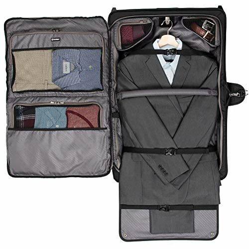 - Extension panel accommodates longer dresses and suit jackets. Metal hanger clamp helps secure hanging garments. Large zippered panel pockets and corner accessory pockets provide packing flexibility