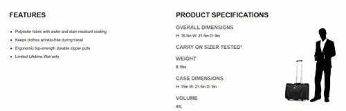 Details: Travel ultra light and assured with Maxlite 4. This extensive collection features 11 singularly lightweight and durable Spinners and Rollaboards with the look and quality of much more expensive luggage. The Carryon Rolling Garment Bag Features: Water repellent coating, inside and out . Telescoping handle . High performance ball-bearing in-line wheels. Protective crash-guard wheel housings. Exterior ticket pocket. Low-profile carry handle. Adjustable hold-down straps with Duraflex anti-break buckles.